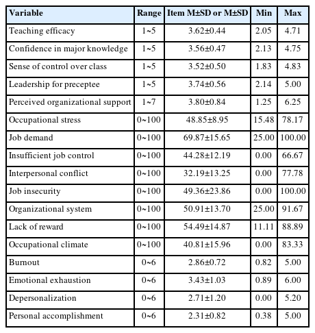 • 대상자의 교수효능감, 조직지원인식, 직무스트레스, 소진의 수준은 평균과 표준편차, 최솟값과 최댓값으로 분석하였다.