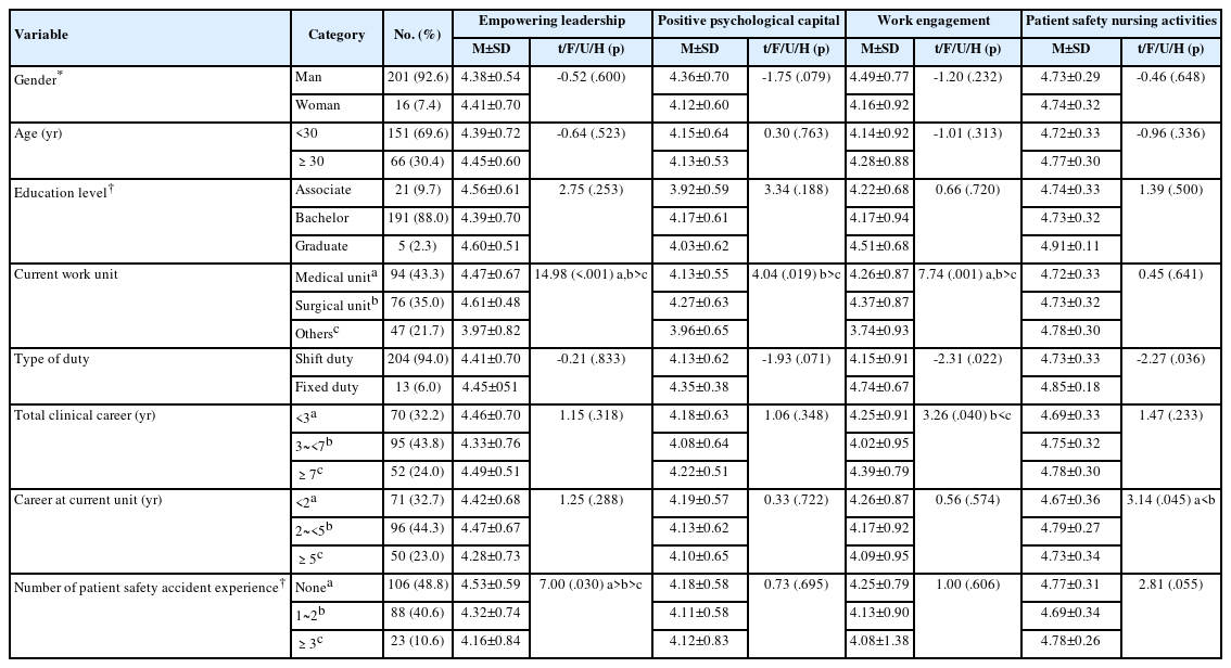 1. 연구 대상자의 일반적 특성과 임파워링리더십, 긍정심리자본, 직무 열의, 환자안전간호활동의 차이