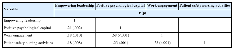 • 간호단위관리자의 임파워링리더십, 간호사의 긍정심리자본, 직무 열의, 환자안전간호활동 간의 상관관계를 파악한다.