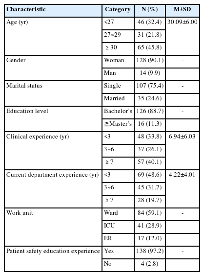연구 대상자의 평균 연령은 30.09±6.00세로, 30세 이상이 65명(45.8%)이었으며, 성별은 여성이 128명(90.1%), 미혼이 107명(75.4%), 학사가 126명(88.7%)으로 가장 많았다. 평균 임상 경력은 6.94±6.03년이었으며, 7년 이상이 57명(40.1%)으로 가장 많았고, 현 부서 근무 경력은 4.22±4.01년이었으며, 3년 미만이 69명(48.6%)으로 가장 많았다. 근무부서는 일반병동이 84명(59.1%)으로 가장 많았고, 최근 1년 내의 환자안전교육 이수 경험은 “유”가 138명(97.2%)으로 대다수를 차지하였다(