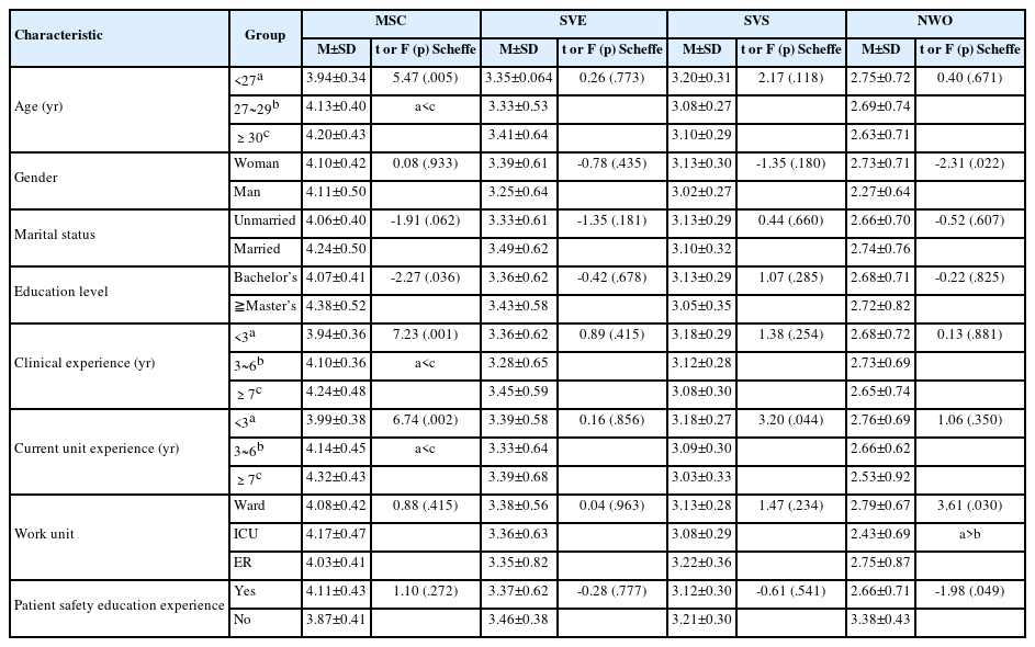 연구 대상자의 일반적 특성에 따른 투약안전역량의 차이를 분석한 결과, 투약안전역량은 연령(F=5.47, p=.005), 최종 학력(t=-2.27, p=.036), 임상 경력(F=7.23, p=.001), 현 부서 근무 경력(F=6.47, p=.002)에 따라 유의한 차이를 보였으며 연령은 30세 이상이 27세 미만보다, 임상 경력 7년 이상이 3년 미만보다, 현 부서 근무 경력 7년 이상이 3년 미만보다 유의하게 높았다.