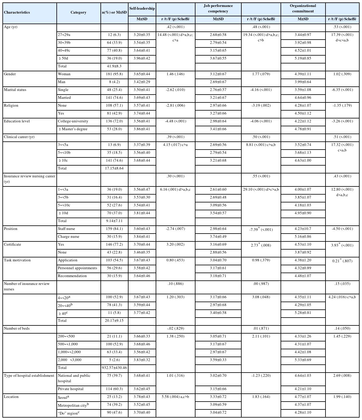 • 보험심사간호사의 일반적 특성에 따른 셀프리더십, 직무수행역량, 조직몰입의 차이를 파악한다.