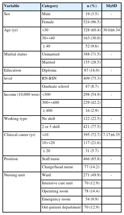 본 연구의 대상자는 여성이 96.5%였으며 남성은 3.5%였고, 연령은 평균 30.0세(standard deviation [SD], 6.34)로 30세 미만이 60.4%, 30∼40세 미만이 30%, 40세 이상이 9.6%로 나타났다. 결혼 상태에 따라서는 미혼이 71.5%, 기혼이 28.5%로 나타났으며, 교육 수준은 3년제 전문대학 졸업이 16.0%, 4년제 학사과정 졸업이 75.3%, 석사 과정 졸업이 8.7%로 나타났다. 월평균 수입은 300만원 미만이 54.9%였고, 300만원∼400만원 미만이 42.2%, 400만원 이상이 2.9%로 나타났다. 근무 유형에 따라서는 상근직이 22.5%였으며, 2교대나 3교대 근무자가 77.5%였다. 임상 경력은 평균 7.17년(SD=6.35)으로 10년 미만이 72.7%였으며, 10년∼20년 미만은 21.6%, 20년 이상은 5.7%로 나타났다. 직위는 일반 간호사가 85.8%였으며, 책임간호사 이상이 14.2%였다. 근무 부서는 병동 49.9%, 중환자실 12.9%, 수술실 14.4%, 응급실 9.9%, 외래 12.9%로 나타났다(