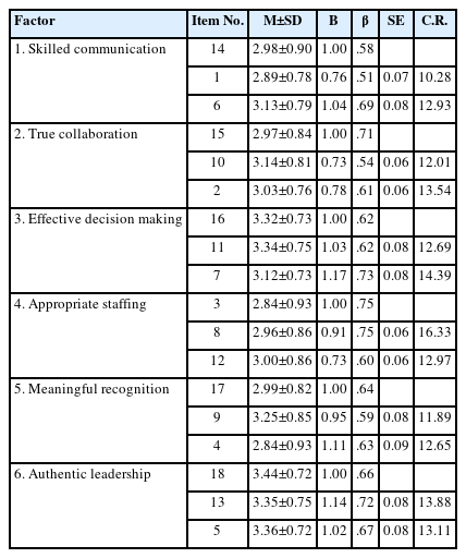 Table 2). 2차 분석(model 2)에서는 통계적인 방법으로 모형적합도 수준을 높이기 위해 수정 지수를 적용하였다. 수정 지수를 적용한 결과 관찰 변수인 문항 1번 “병원 행정가, 간호관리자, 의사, 간호사와 기타 직원은 빈번한 의사소통을 하여 조직 내 의사결정에 당황하거나 놀라는 일이 없다.”와 2번 “병원 행정가, 간호관리자, 의사는 간호사와 기타 직원을 조직 내 중요한 의사결정에 적절한 수준에서 참여시킨다.”, 문항 12번의 “간호사와 직원이 환자와 보호자를 돌보는데 우선순위를 두고, 요구에 따라 적절한 시간을 할애할 수 있도록 지원 서비스가 제공된다.”와 13번 “간호 리더(관리자, 간호부서장, 전문간호사 등)는 돌봄 현장의 역동과 요구를 알고 있으며, 이러한 지식을 건강한 업무환경 조성을 위해 활용한다.”와의 오차항 공분산이 가장 컸는데, 이는 1번 문항과 2번 문항 간 그리고 12번과 13번 문항 간 예측되지 않은 잔여 부분의 상관관계가 있음을 나타내는 것이다. 각각의 잠재 변수(요인)와 관찰 변수의 표준화 회귀계수를 검토하여 모델적합도 개선이 높은 1번과 12번 문항을 국내 문화적 특성을 고려하여 관찰 변수와 잠재 변수 간의 논리적인 적합성 및 관련성이 높다고 판단되는 곳으로 이동하여 2차 모형적합도 분석을 시행하였다. 즉, 문항 1번은 요인1(숙련된 의사소통)에서 요인2(진정한 협력)로 이동시키고, 문항 12번은 요인4(적절한 인력배치)에서 요인6(진성 리더십)으로 이동시켰으며, 요인2(e1↔e2), 요인3(e7↔e16), 요인6(e5↔e12, e12↔e13, e12↔e18) 각각의 요인 내에서 수정 지수가 높은 오차항을 연결하여 분석하였다. 그 결과 model 2에서