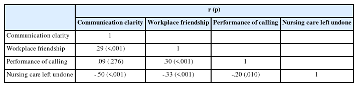 (3) 대상자의 미완료 간호, 의사소통 명확성, 팀 내 친밀감과 소명 수행 간의 상관관계는 Pearson's correlation coefficient를 분석하였다.