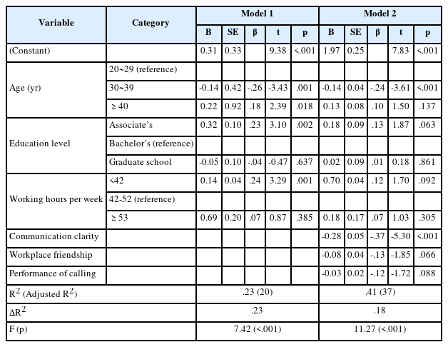 Communication clarity, workplace friendship, and performance of calling were significantly correlated with nursing care left undone. Hierarchical multiple regression analysis identified communication clarity (β=-.37, p<.001) and being aged 30–39 years (β=-.24, p<.001) as the main factors influencing nursing care left undone, collectively explaining 37% of the total variance.
