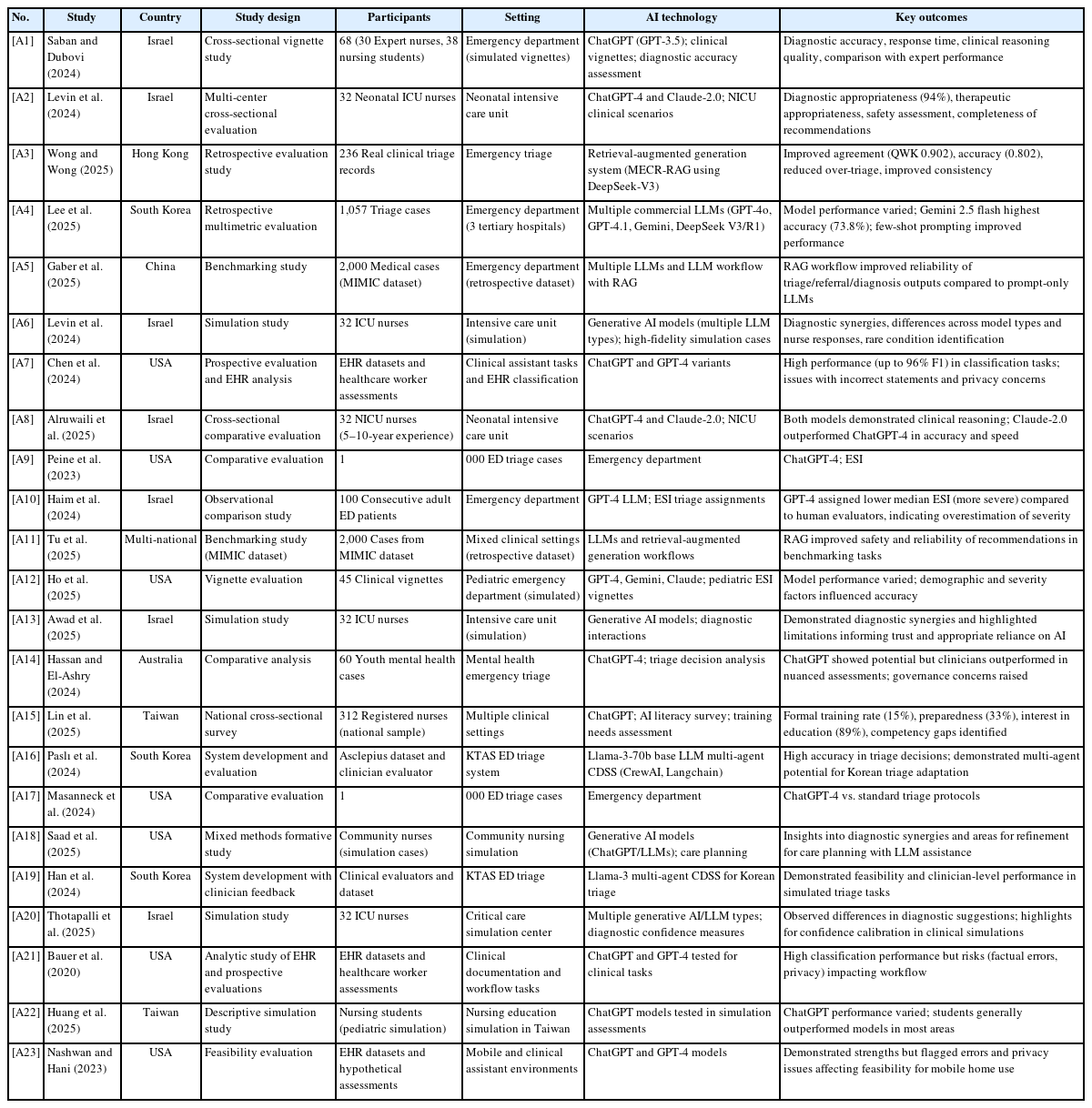 Table 1. The 23 included studies were published between 2020 and 2025, with most (n=12) appearing in 2024 (52%), appearing in 2024 (52%), followed by 2025 (n=8, 35%), 2023 (n=2, 9%), and 2020 (n=1, 4%), reflecting rapidly increasing scholarly attention to generative AI in nursing. Research was conducted globally, with Israel contributing the largest number of studies (n=4, 17%), followed by Taiwan (n=4, 17%), multi-national studies (n=5, 22%), South Korea (n=2, 9%), USA (n=2, 9%), and Germany (n=2, 9%). Additional individual studies originated from Saudi Arabia, Hong Kong, Turkey, and Australia, indicating broad international engagement. The included studies applied varied research methodologies, including experimental or pilot evaluations, simulation-based studies, cross-sectional research, and qualitative designs. Sample sizes ranged widely depending on study type and purpose. from 10 nurse leaders to 312 nurses in participant-based studies, and 45 to 2,000 cases in vignette or retrospective dataset evaluations. Clinical settings also varied, with research conducted in high-acuity environments such as intensive care units (n=7, 30%) and emergency departments (n=9, 39%), as well as general hospital settings (n=4). Additional settings included community/home health nursing (n=2, 9%) and oncology nursing (n=1, 4%). Participants represented multiple nursing roles, including registered nurses, advanced practice nurses, ICU and emergency nurses, and nurse administrators, supporting applicability across diverse clinical contexts.