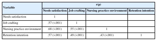 Table 3.Correlations between Needs Satisfaction, Job Crafting, Nursing Practice Environment and Retention Intention (N=194)