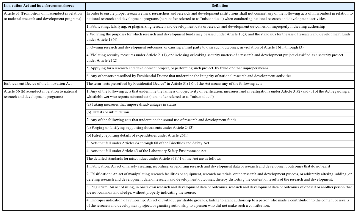 In order to ensure proper research ethics, researchers and research and development institutions shall not commit any of the following acts of misconduct in relation to national research and development programs (hereinafter referred to as “misconduct”) when conducting national research and development activities |